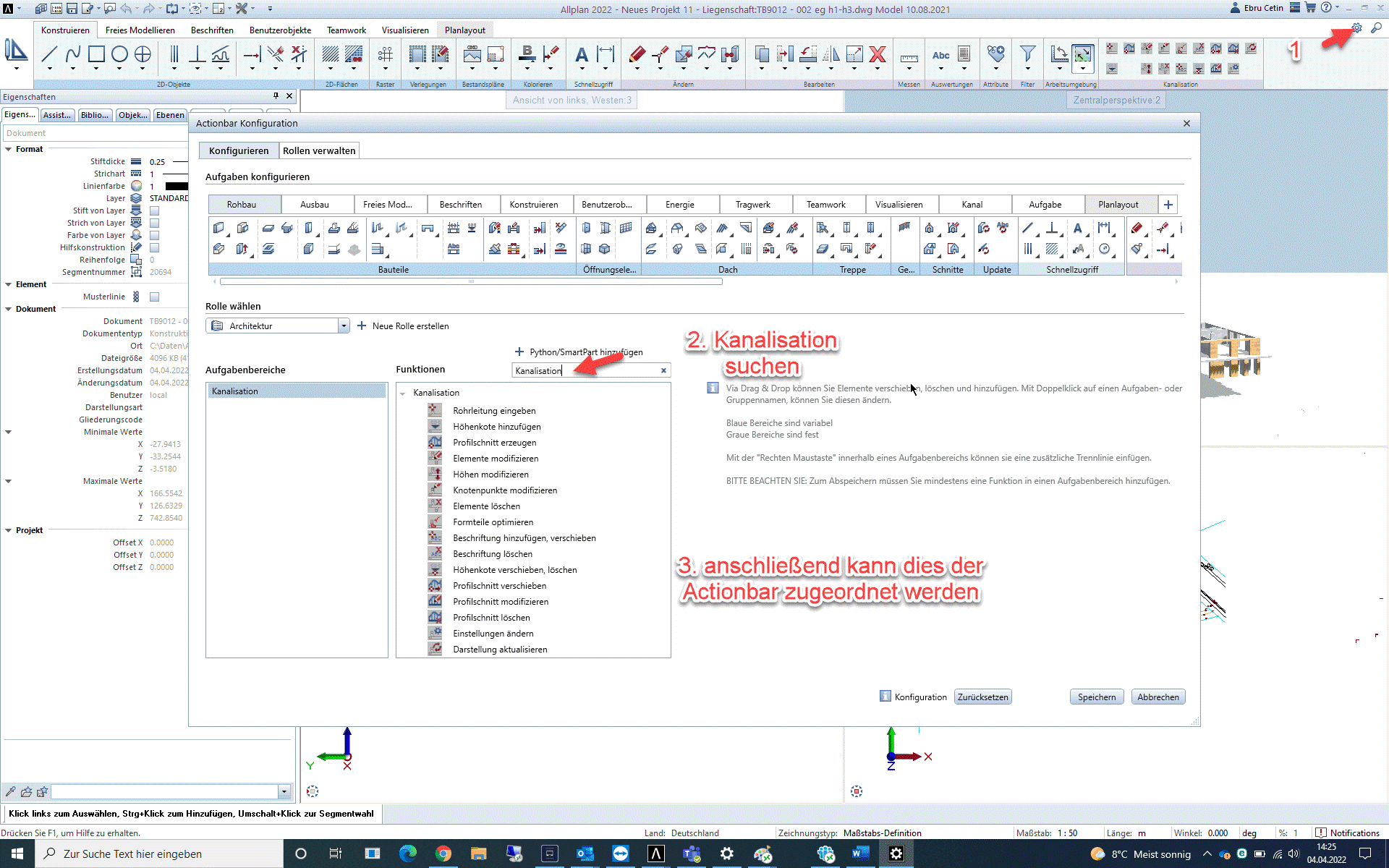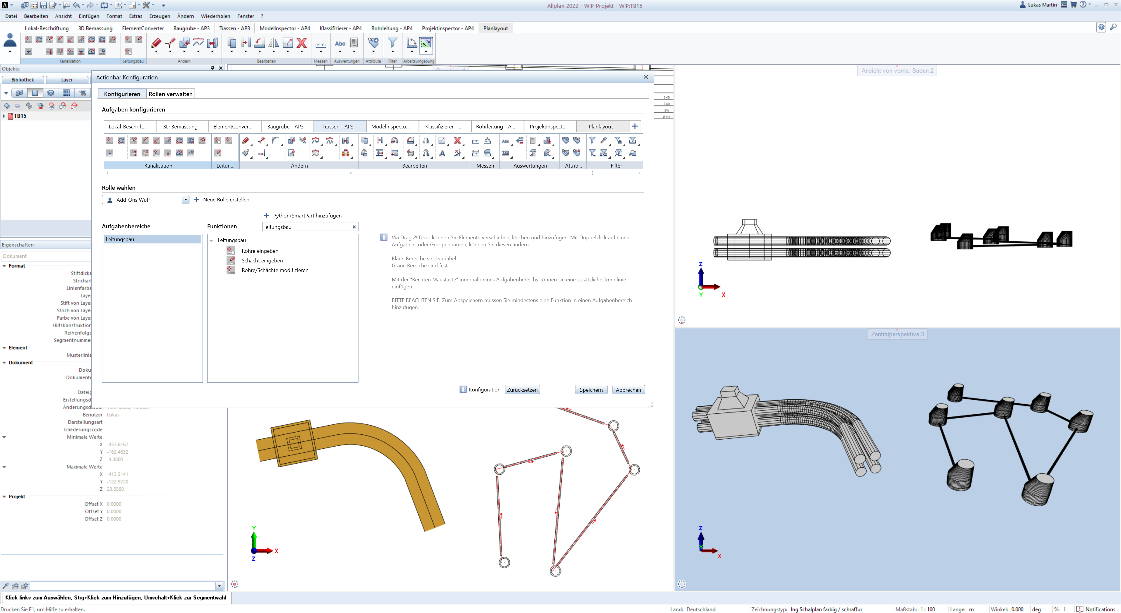 Das Modul Kanalisation und Leitungsbau kann nur im Zusammenhang mit der Actionbar genutzt werden. Hierfür muss dies über die Rollen in Ihre Actionbarkonfiguration mitintegriert werden:
