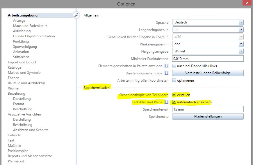 Hinweis zu Punkt 2. und 3.: Die Option Sicherungskopie von Teilbildern erstellen wird aktiviert über: Extras – Optionen – Arbeitsumgebung (Allgemein)– Speichern/Laden“ / Sicherungsdatei von Teilbildern / erstellen und Teilbilder / automatisch speichern