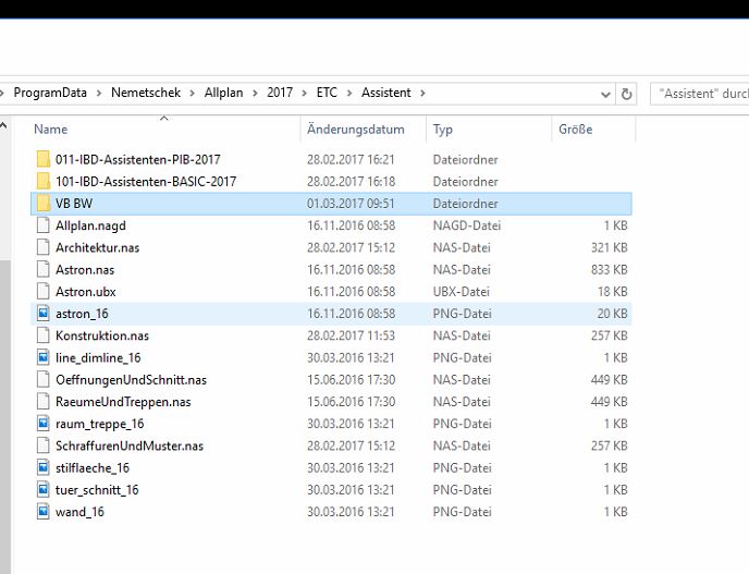 Im Fall Land BW – Ordner VB BW – die Assistenten und Assistentengruppen ablegen , dann wird im Allplan auch diese beim Aufruf der Assistenten angezeigt: