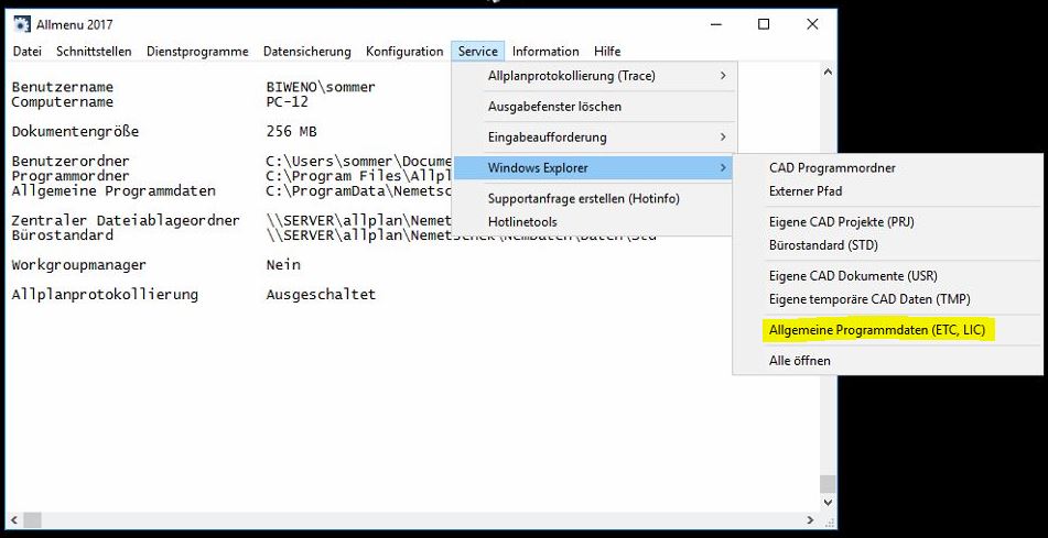 2. Im Allmenü kann man sich über Service/ Windows Explorer den Pfad ETC anzeigen bzw. öffnen lassen: