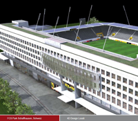 „Durch den Einsatz von Allplan und CINEMA 4D konnte ich die Aufgaben in sehr kurzer Zeit bewältigen. Dies gelang, weil ich von Anfang an mit beiden Programmen parallel arbeiten konnte.“ Hardy Loosli, FCS Park Schaffhausen, Schweiz – 4D Design Loosli Bern/Schweiz