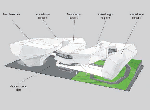 Von der Struktur her gliedert sich der Pavillon in zwei Bestandteile. Eine begehbare Terrassenlandschaft mit Veranstaltungsfläche erstreckt sich vom Erdgeschoss bis zum dritten Obergeschoss. Der Baukörper mit seinen vier Ausstellungsabschnitten bildet das Dach, das die Besucher vor Sonne und Regen schützt. Diese vier Ausstellungsbereiche stehen für typische Stadträume: Arbeit und Denken, Freizeit und Erholung, Wohnen sowie Kultur und Gemeinschaft. Der Weg durch das Gebäude endet in der Energiezentrale. Von dort wird der Besucher über drei Treppenanlagen wieder nach unten auf den Veranstaltungsplatz geleitet.
