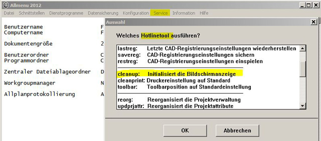 Diesen Effekt habe ich beobachtet und als Lösung funktioniert Allplan zu schliessen und Allmenü zu starten . Im Allmenü folgende Funktion auszuführen: Service / Hotline Tools / cleanup Bildschirmanzeige: