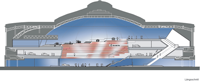 Eine scheinbar schwebende Ringfigur bildet das große memorable Bild. Sie ist in die bestehende Kontur der Festhalle eingefügt. Ihre Fassade wird zum Innenraum hin mit horizontalen Lamellen aufgelöst und erscheint – je nach Blickwinkel – eher offen oder eher begrenzend. Sie lässt so immer wieder neu das Ganze oder die Teile erleben. Gezielte Öffnungen schaffen besondere Orte, laden zum Verweilen und Beobachten ein, verschaffen Überblick, Konzentration und Kontemplation im Wechsel. Die Vorderkanten der geschwungenen Lamellen sind ringsum medial bespielt. Sie entmaterialisieren die Figur und unterstützen die wechselnden Perspektiven. Der Zentralraum der Festhalle und das Innere der Ringfigur stehen in einem spannenden und stets erlebbaren Dialog.