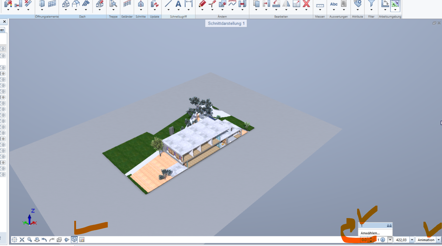 2. Schnitt anwählen und auf Animationsdarstellung mit Perspektive schalten: