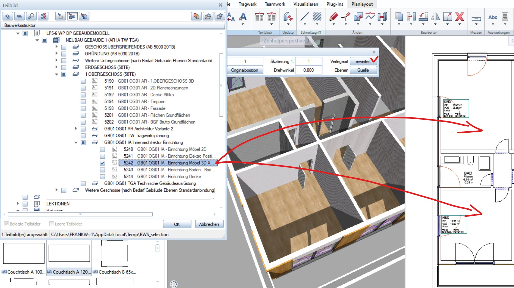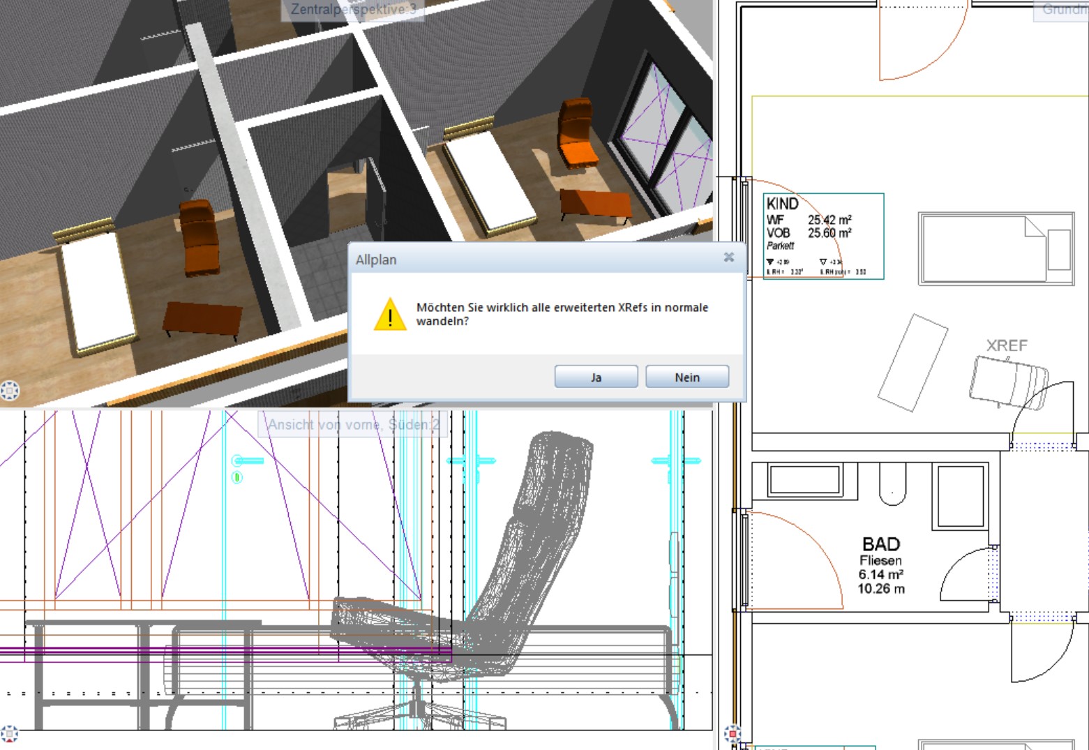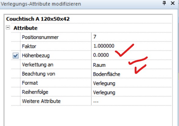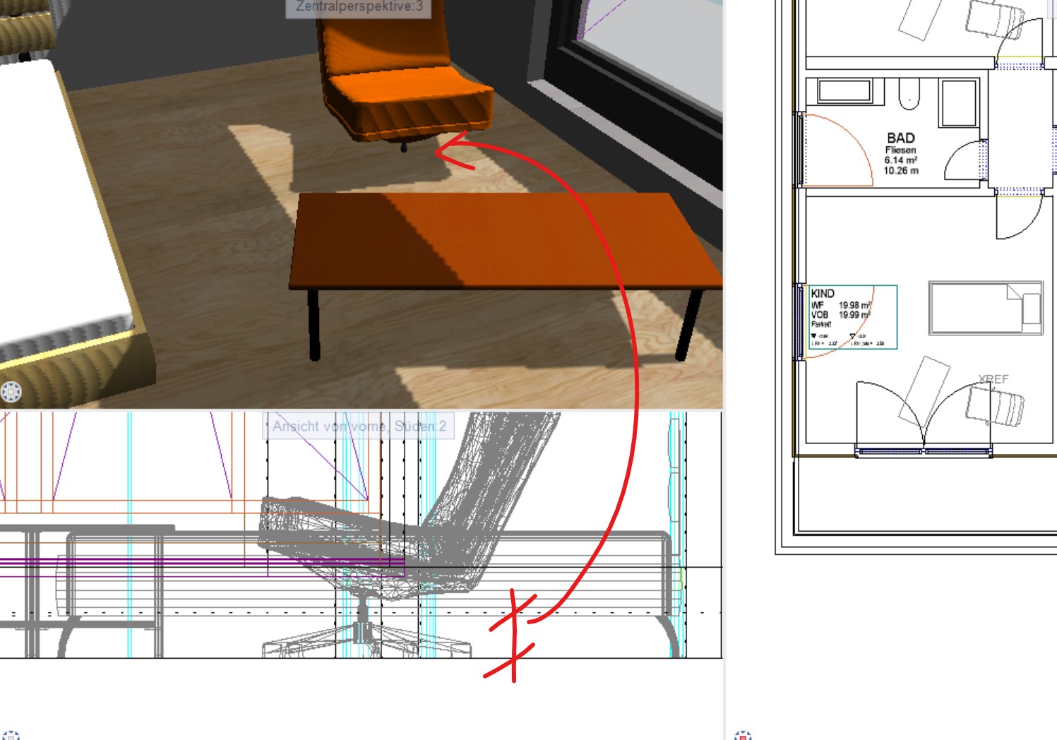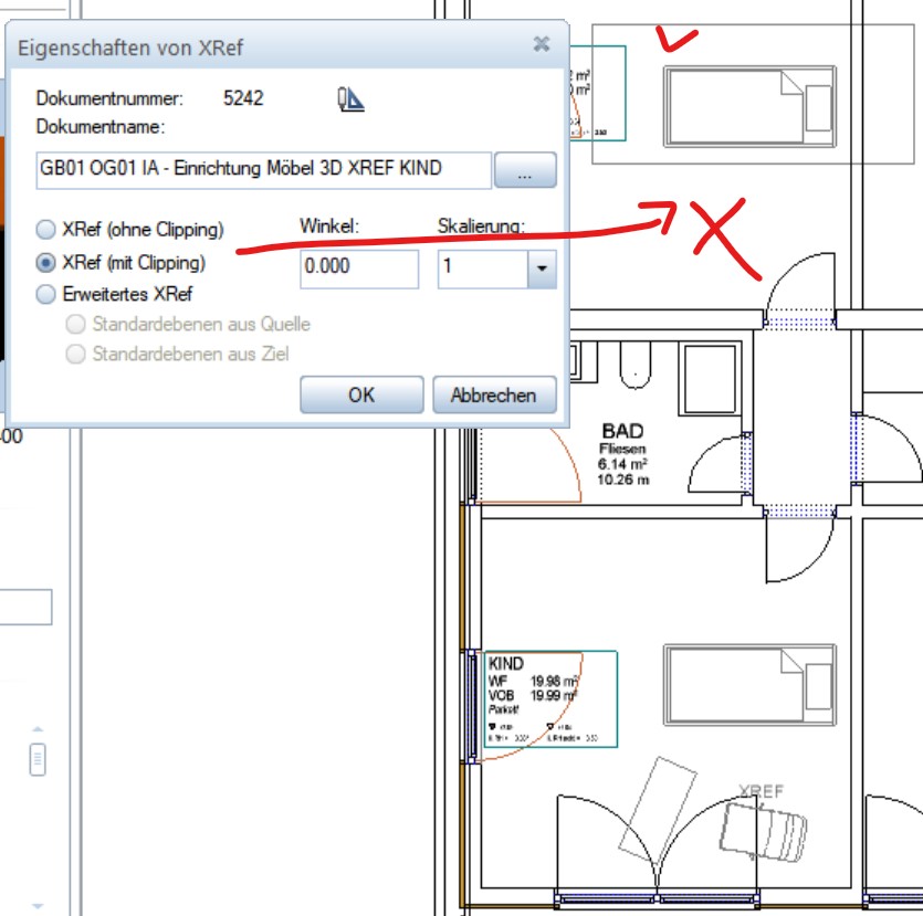 5. Wichtig: Bei XREFS werden jedoch, da diese Möbel nicht im Raum gezeichnet wurden sondern nur als XREF referenziert, nicht die Ausbauhöhen des jeweiligen Ziel-Raum berücksichtigt:
