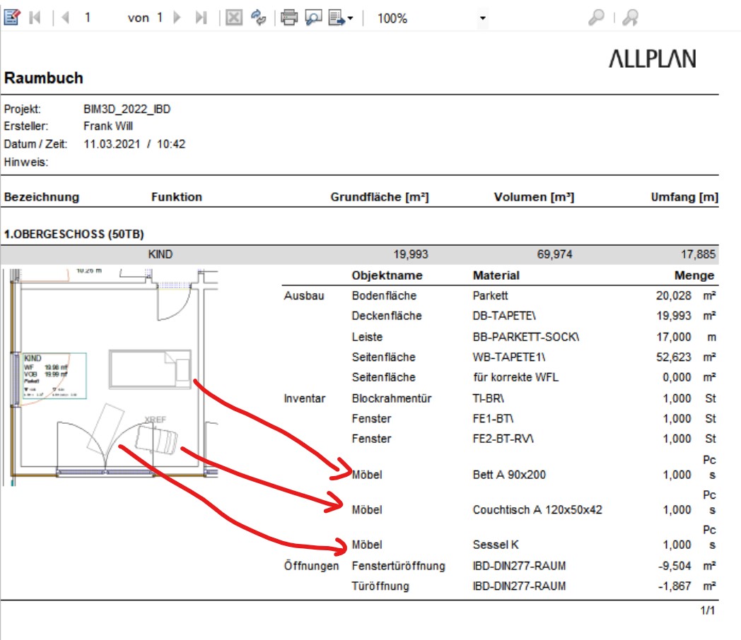 4. Im Report Raumbuch werden bei allen verlegten XRef, trotzdem dass die Möbel nicht im Raum gezeichnet wurden, diese korrekt aufgeführt: