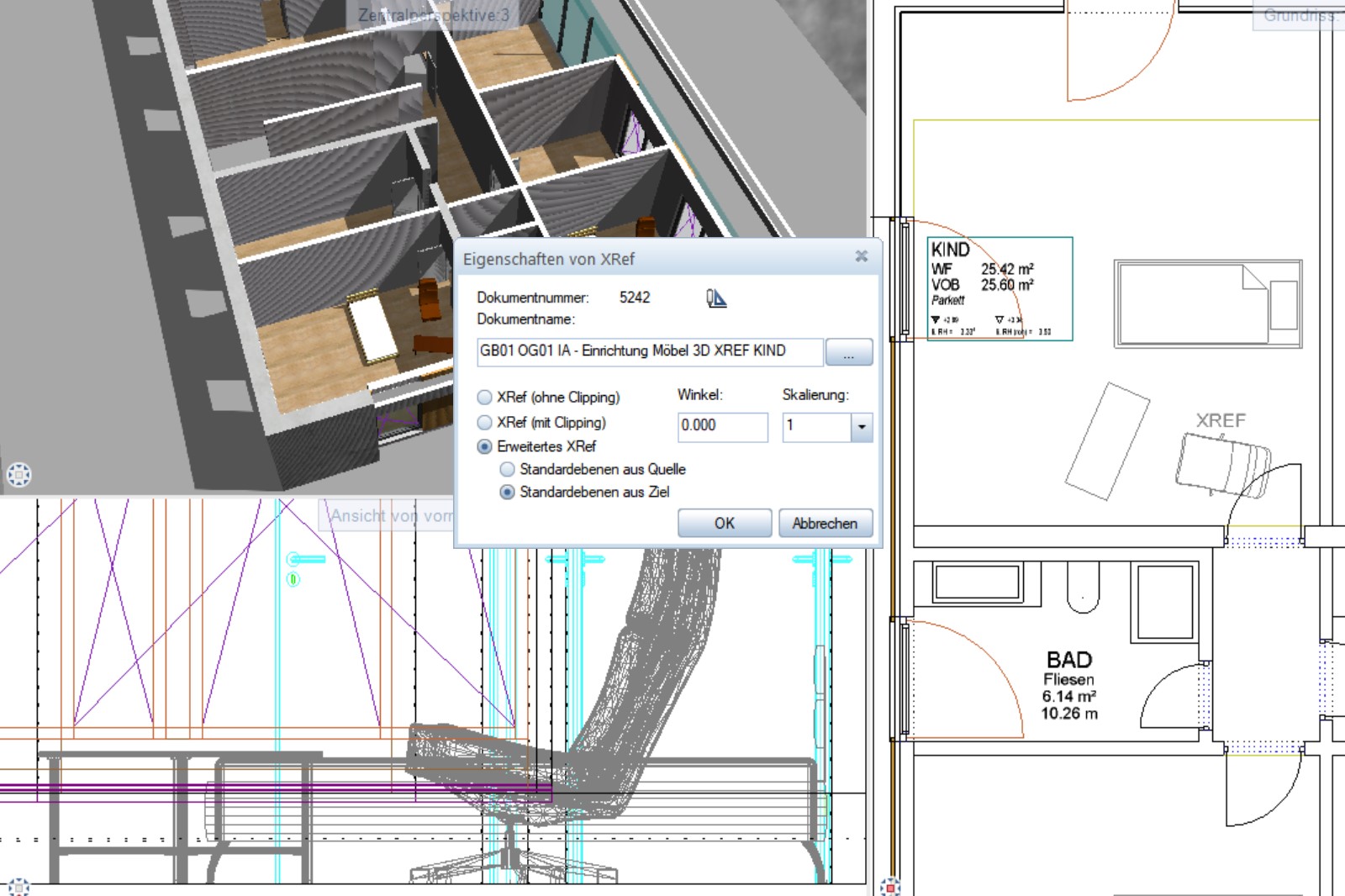 9. Normale XREF (ohne Clipping) bedeutet, dass das XREF in 2D sichtbar verlegt bleibt, aber die 3D Animation und die Standardebenen aus Quelle und ziel verschwinden also so :