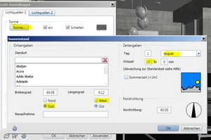 Im Editor erkennt Ihr dann die Änderungen des Lichtsettings. Bei den Einstellungen für die Sonne könnt Ihr den August bei 15 Uhr einstellen . Wichtig ist Orientierung mit Süd und Ost, damit bekommt Ihr bei diesem Projekt ein schönen langen Schattenwurf: