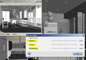 5. Abschliessend könnt Ihr dann die Helligkeit, Kontrast und Farbsättigung verändern, wobei bei diesem Projekt die Farbsättigung durch die wenigen Farben nicht ins Gewicht fällt, Aber feinfühlig damit umgehen den die Helligkeit zu erhöhen führt schnell zum Überstrahlen des Renderings. Reduzierter wirkt das Rendering , wenn Ihr die Farbsättigung ein wenig herunterfahrt: