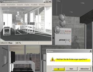Mit der Taste F4 kommt Ihr schnell in die Animation. Stellt Euch einfach in die Tür wie oben auf dem fertigen Renderbild. Mit der Allplan Funktion „Einzelbild rendern“ :