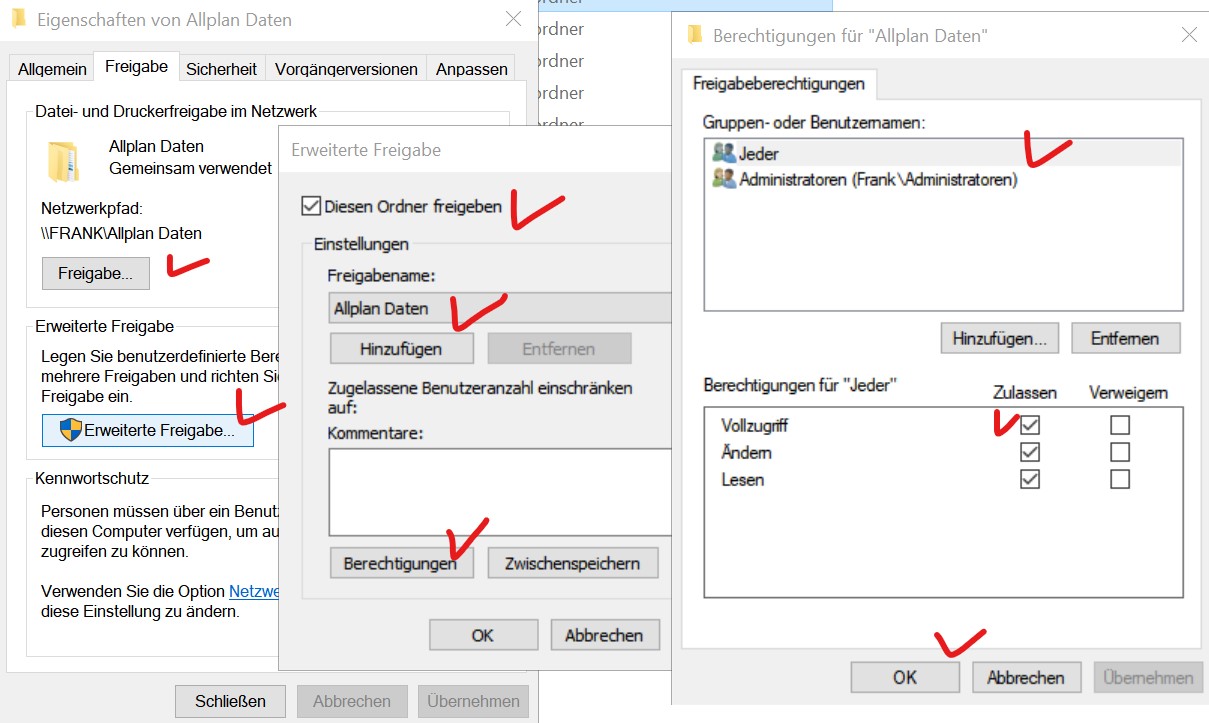 Allplan fordert wie bei älteren Versionen die Ordnerfreigabe unter Windows siehe weiter unten!