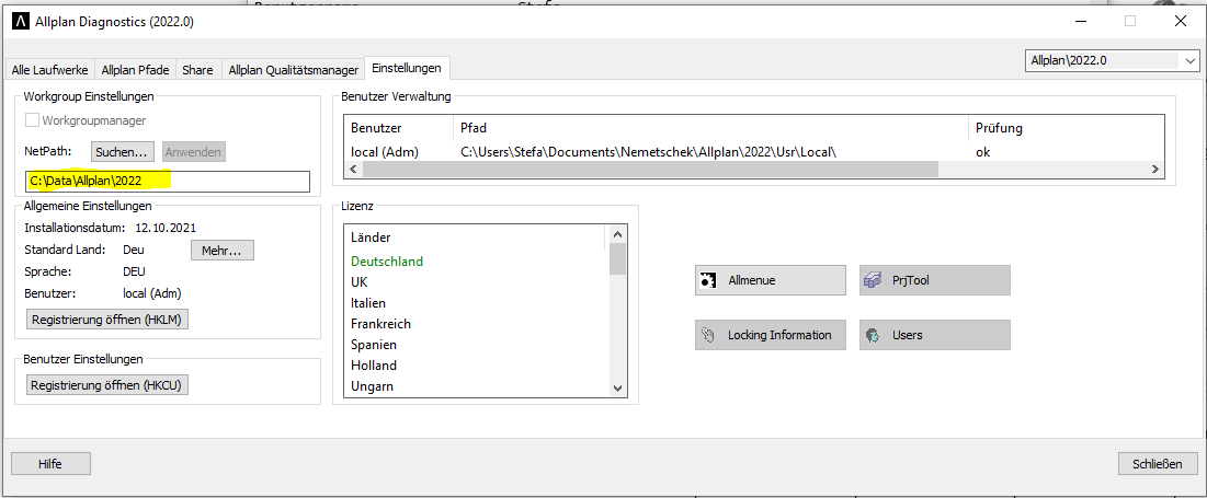 Nach der Installation von Allplan / Allmenü / Service / Allplan Diagnostics aufrufen. Unter Einstellungen den NethPath – also den Serverpfad – angeben und Hacken rein bei Workgroupmanager: