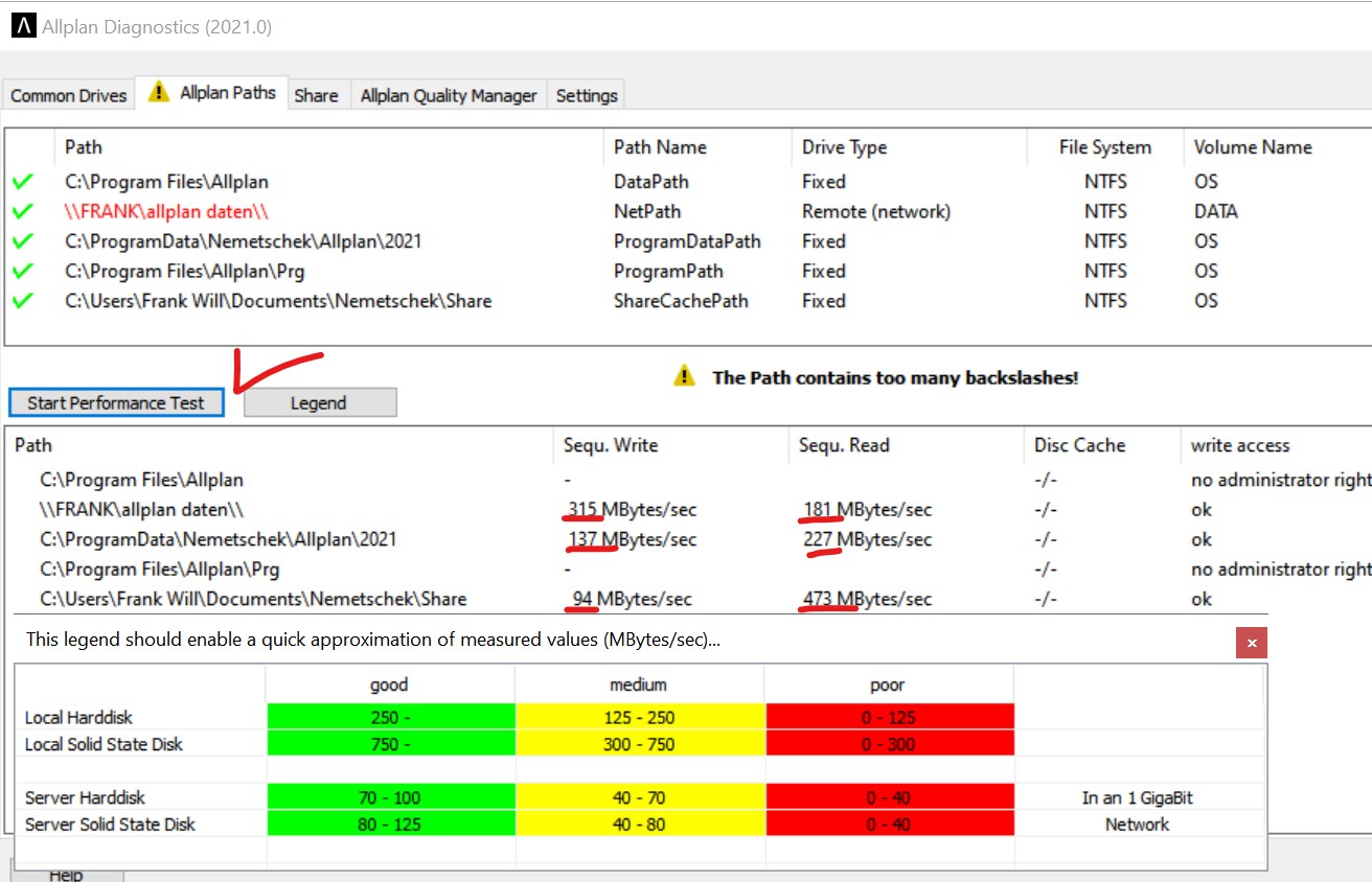 Welche Pfade nutzt Allplan eigentlich? Haben falsche Einstellungen Auswrikungen auf die Performance ? Start Test dieser Netzverbindungen mit Bewertung und Legende, ob die Leistung stimmt:03