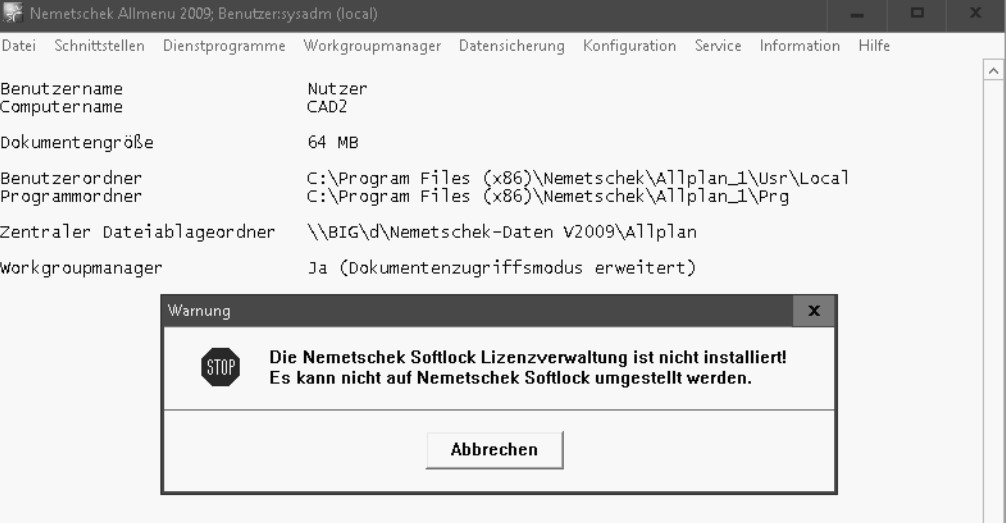 Softlock: Allplan ist bei Ihnen durch Softlock geschützt. Reparieren Sie Ihre Softlock Verwaltung wie in der Anleitung unter folgendem Link beschrieben: https://connect.allplan.com/de/faqid/20131024085525.html