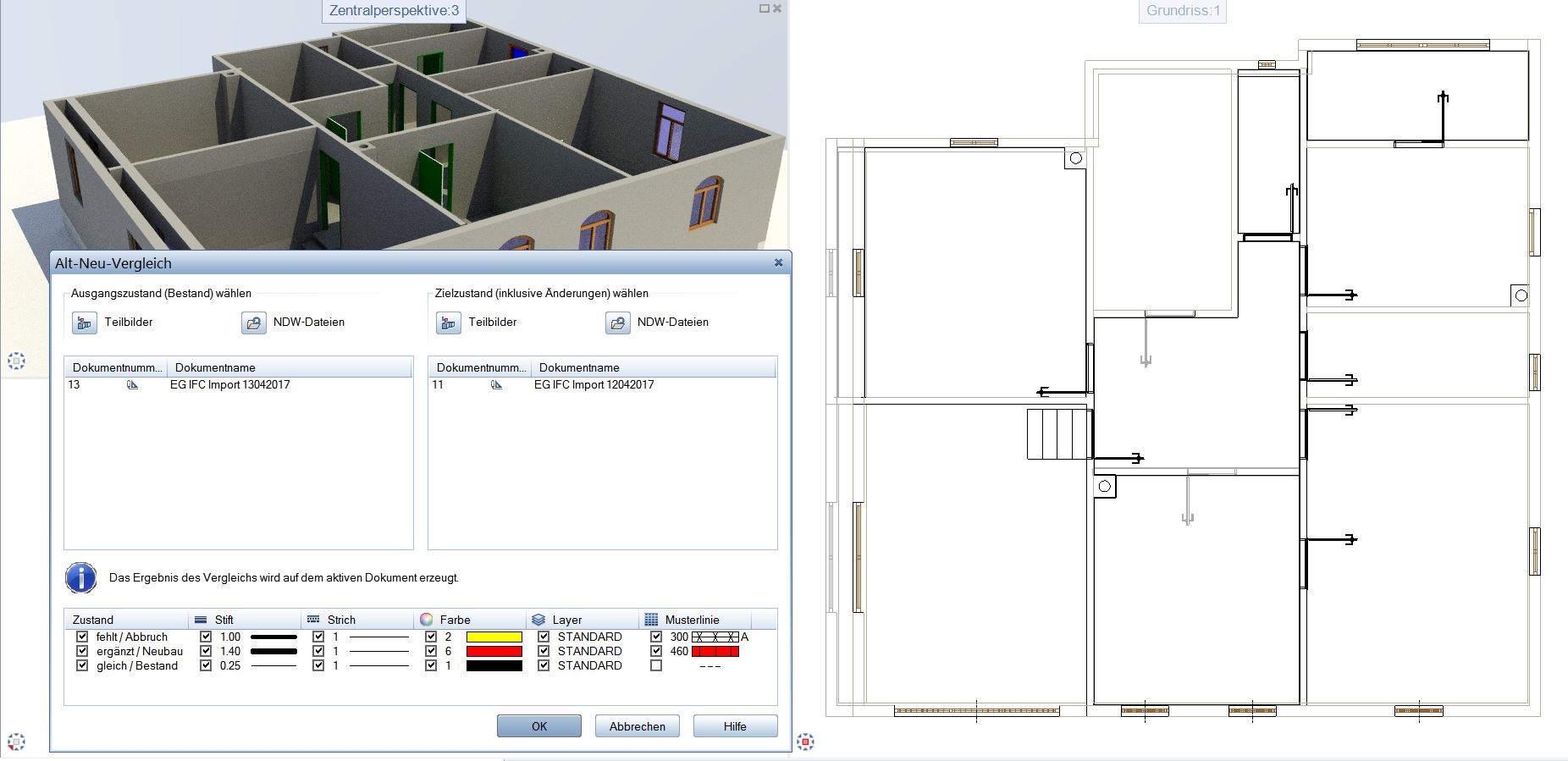 3. Nach Export Ausgangsmodell A und Import des IFC Änderungsmodell B werden beide Modelle A und B übereinander gelegt im Ursprung . Mit der BIM Workflow Funktion über Extras Alt-Neu-Vergleich werden die beiden Ausgangszustand und Zielzustand Teilbilder auswählt und vergleichen: