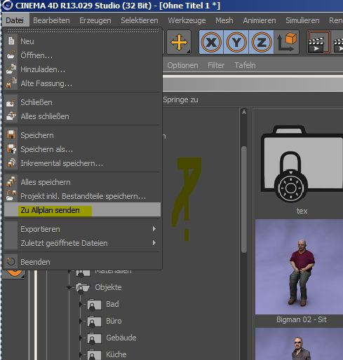 Antwort: Unter Datei findet Ihr in Maxon Cinema 4D R13 die Funktion zu Allplan senden: