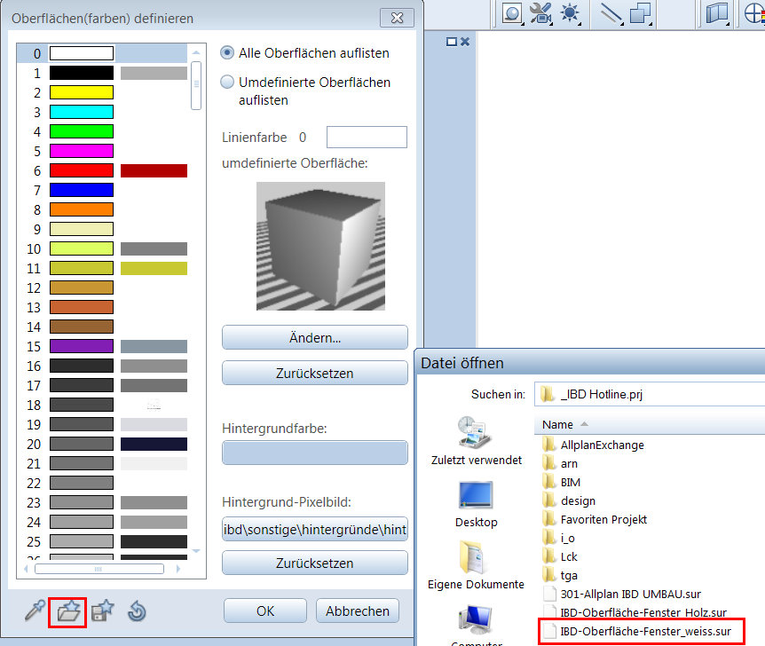 Mit den Laden Werkzeug links unten habt Ihr nun die Möglichkeit – ganz einfach – die korrekten -IBD Texturen Surf Dateien -Texturen wieder zu laden. Z.B IBD Oberfläche-Fenster-weiss.SURF für den Stift weiss !