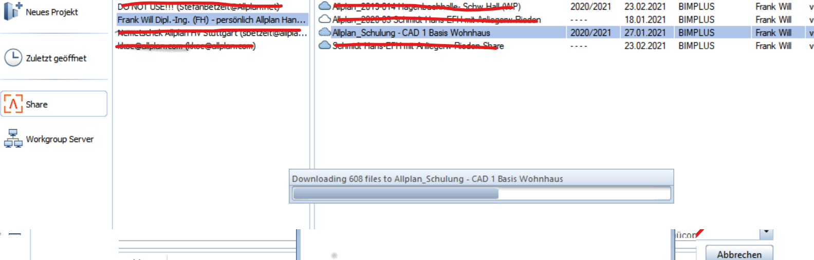 Hierbei wird das komplette bestehende Projekt nach BIMPlus verschoben oder kopiert und dort angelegt. Dies dauert beim ersten mal je nach Projektgrösse und Leitungs-geschwindigkeit.