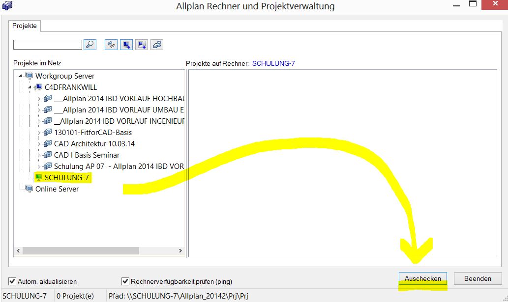 Es ist wichtig das Euer Allplan beendet ist und natürlich auch bei der Installation der Workgroup installiert wurde. (Installations Lizenz mit Workgroup) . Nach der Bestätigung einfach auschecken (noch ohne Projekte):