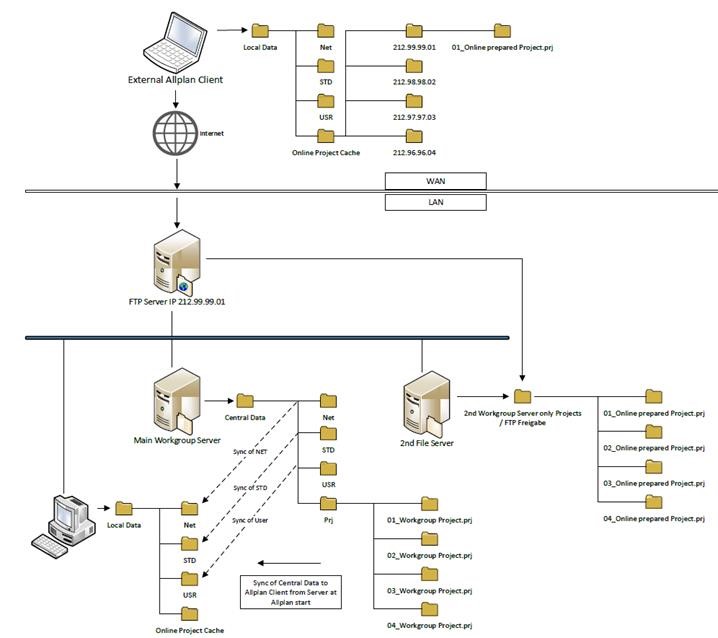 Nehmen Sie einen zusätzlichen Rechner als Workgroup Server auf, setzen Sie den FTP Server auf diesem Rechner auf, verschieben Sie dann auf diesen Server die Projekte, die online bearbeitet werden sollen und bereiten Sie diese Projekte online vor.- FTP Benutzer und Benutzerrechte auf FTP Server einrichten (Allplan Administrator bzw. Systemadministrator)