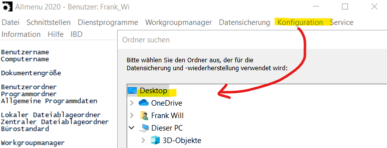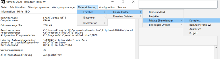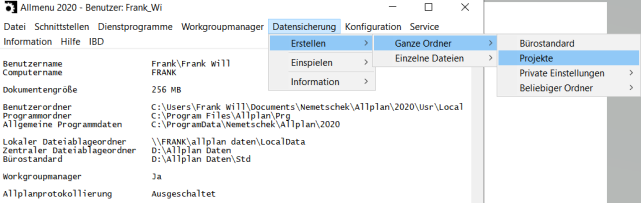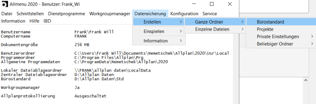 - Ermittelt vor der Installation der zusätzlichen Arbeitsplätze die genaue Lage des Zentralen Dateiablageordners an einem bereits installierten Arbeitsplatz. Öffnet dazu nur das Allmenu:(Beispiel: \\ C4DFRANKWILL\ Daten WGM 2014 \ DATEN Workgroup 2014).