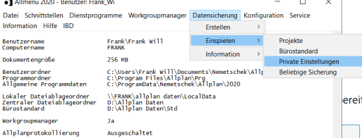 - Im Allmenu-Fenster wird in der vorletzten Zeile der genaue Pfad des Zentralen Dateiablageordners angezeigt. Gebt diesen Pfad bei der Installation des zusätzlichen Arbeitsplatzes an der Stelle Zentraler Dateiablageordner ein!