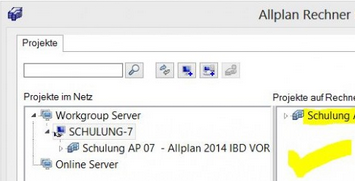 - Nach der Installation überprüfen und Allplan starten. In Allplan Projekt neu /öffnen findet Ihr unter Projektort nun den Rechner/Server auf dem die Daten-Projekte liegen: