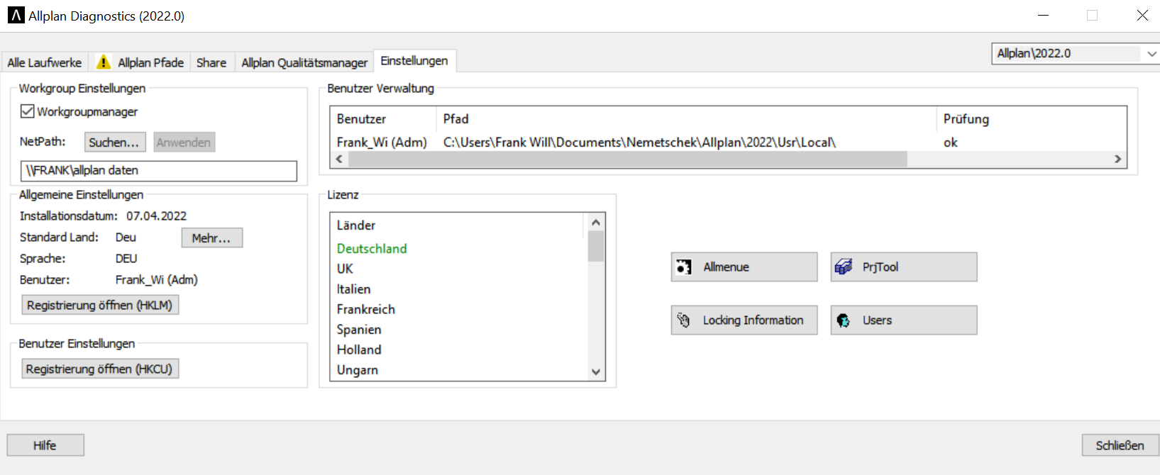 Nach der Installation von Allplan / Allmenü / Service / Allplan Diagnostics aufrufen. Unter Einstellungen den NethPath – also den Serverpfad – angeben und Hacken rein bei Workgroupmanager: