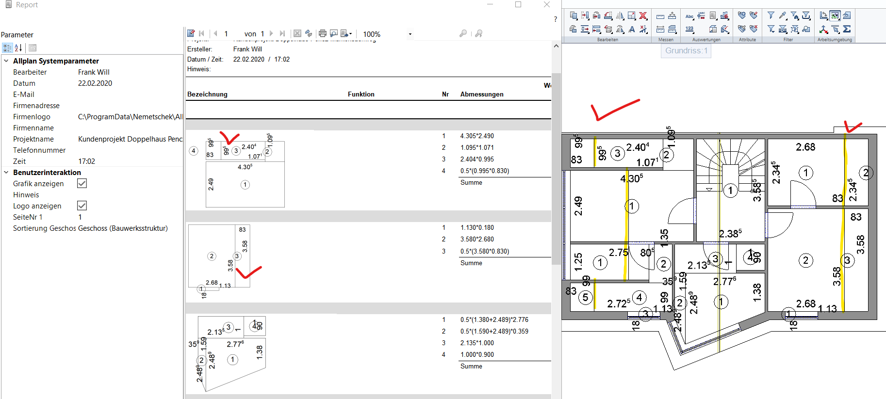 Wenn dann unter Reports die Wohnflächen beim Fertigmass die Berechnung der Grundfläche „Rohbau mit Pauschalabzug“ z.B 3% ausgewählt wird: