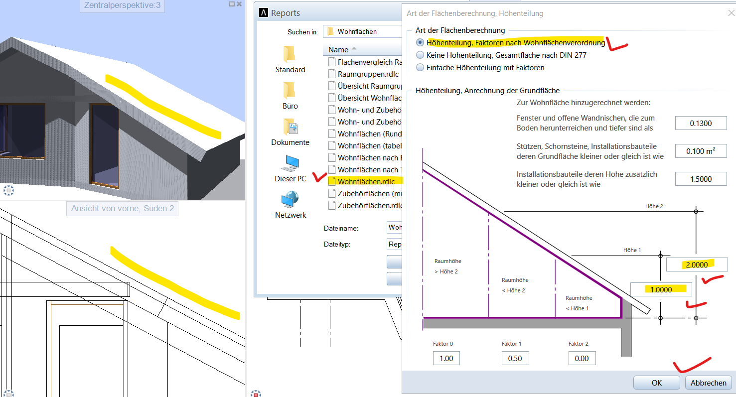 3. Die Wohnflächen unter Reports auswählen: mit den Einstellungen: