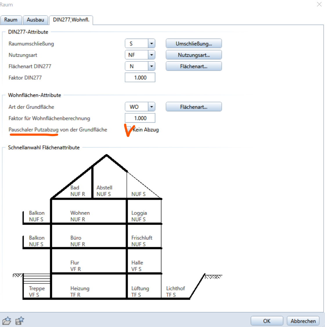 Die Einstellungen für pauschalen Putzabzug werden im Raum über DIN277/Wohnflächen gesteuert. :