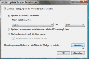 Wählt im Dialog „Allplan Update Sysadm Einstellungen“ „Updates automatisch installieren“ und „Verteilen“.