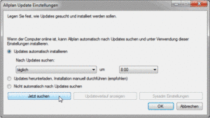 Bitte startet Allplan und ruft in der Menüleiste unter „?“ den Punkt Allplan Update auf. Wählt „Updates automatisch installieren“ und anschließend „Jetzt suchen“.